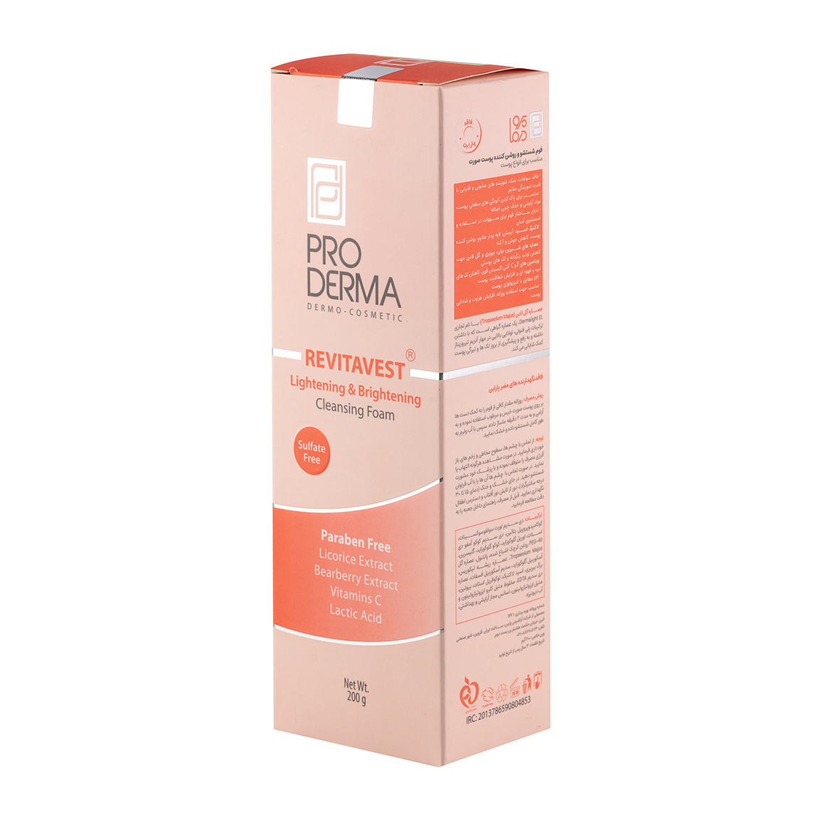 فوم شستشو و روشن کننده پرودرما ساخت شرکت آراشیمی پارس است و در حجم 200میل عرضه میشود. این محصول فاقد پارابن، سولفات، نمک و پاک کنندههای صابونی به همین دلیل از آسیب به پوست صورت جلوگیری میکند. فوم شستشو و روشن کننده پرودرما پاک کردن آرایش، آلودگیهای محیطی و حذف چربیها از روی پوست بسیار مؤثر است. همچنین در ترکیبات این فوم از لاکتیک اسید استفاده شده است که خاصیت آبرسانی و روشن کنندگی دارد و از بروز جوش و آکنه بر روی پوست جلوگیری میکند. علاوه بر این در فرمولاسیون این محصول از عصاره لیکوریس، بیربری و Deralight EL استفاده شده است که موجب رفع لکهای قهوهای و تیره پوست میشود. ویتامین سی موجود در این فوم باعث شفافیت پوست میشود و خاصیت آنتی اکسیدانی آن اثر بخشی بالایی بر روی پوست دارد.